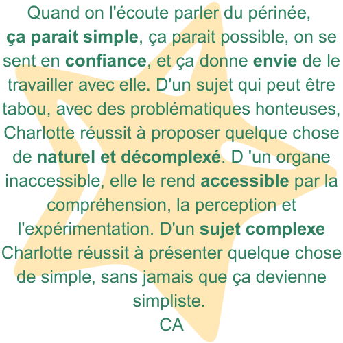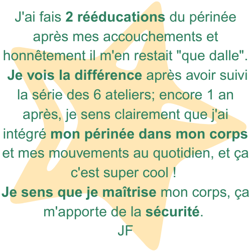 On apprend à retrouver le contrôle de son périnée, à se sentir plus en confiance dans son corps, sans jamais se sentir jugé.e.