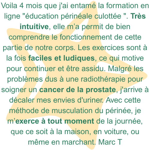 Une rééducation du périnée peut être proposée. Malheureusement ce n’est pas évident de trouver un kiné spécialisé pour les hommes et la majorité du temps, ils proposent une sonde anale (à mettre dans l’anus)…